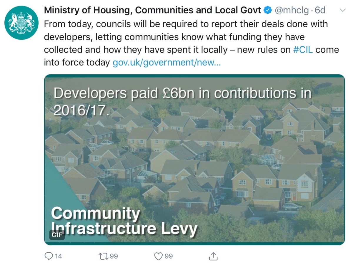 What has been nagging away at me in the tweet was the gif image: “Developers paid £6bn in contributions in 2016/2017…Community Infrastructure Levy”.