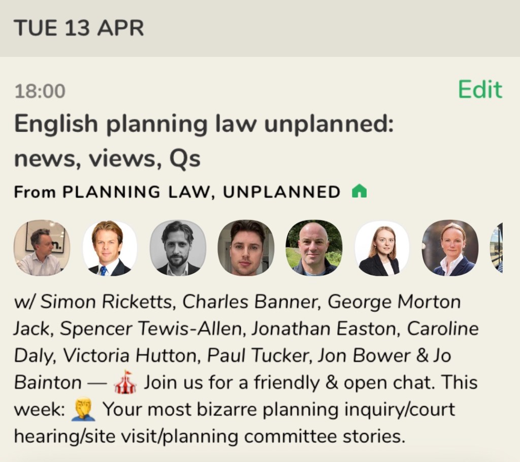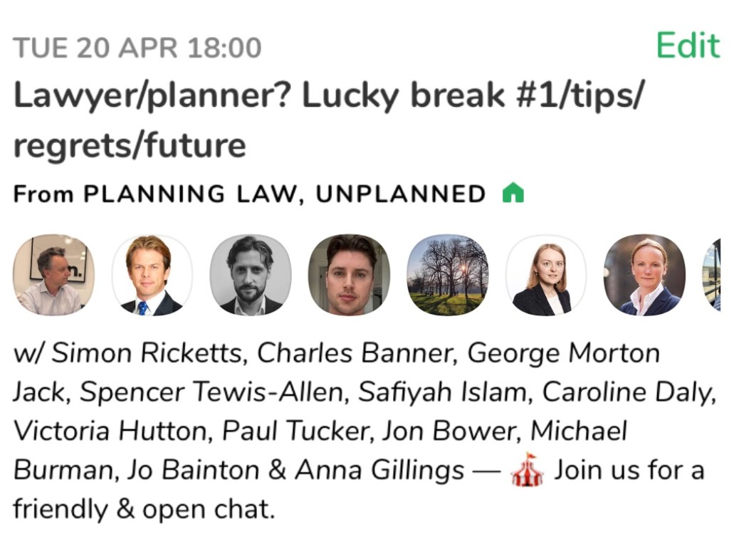 PS This week’s clubhouse Planning Law Unplanned session will be a careers special. 6pm, 20 April. As always, message me for more information.