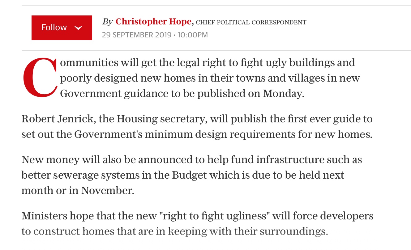 In the meantime of course the Building Better, Building Beautiful Commission is working on its final report, anticipated in December 2019, following on from its interim recommendations that I covered in my 27 July 2019 blog post New Cabinet, Poor Doors, No Windows.