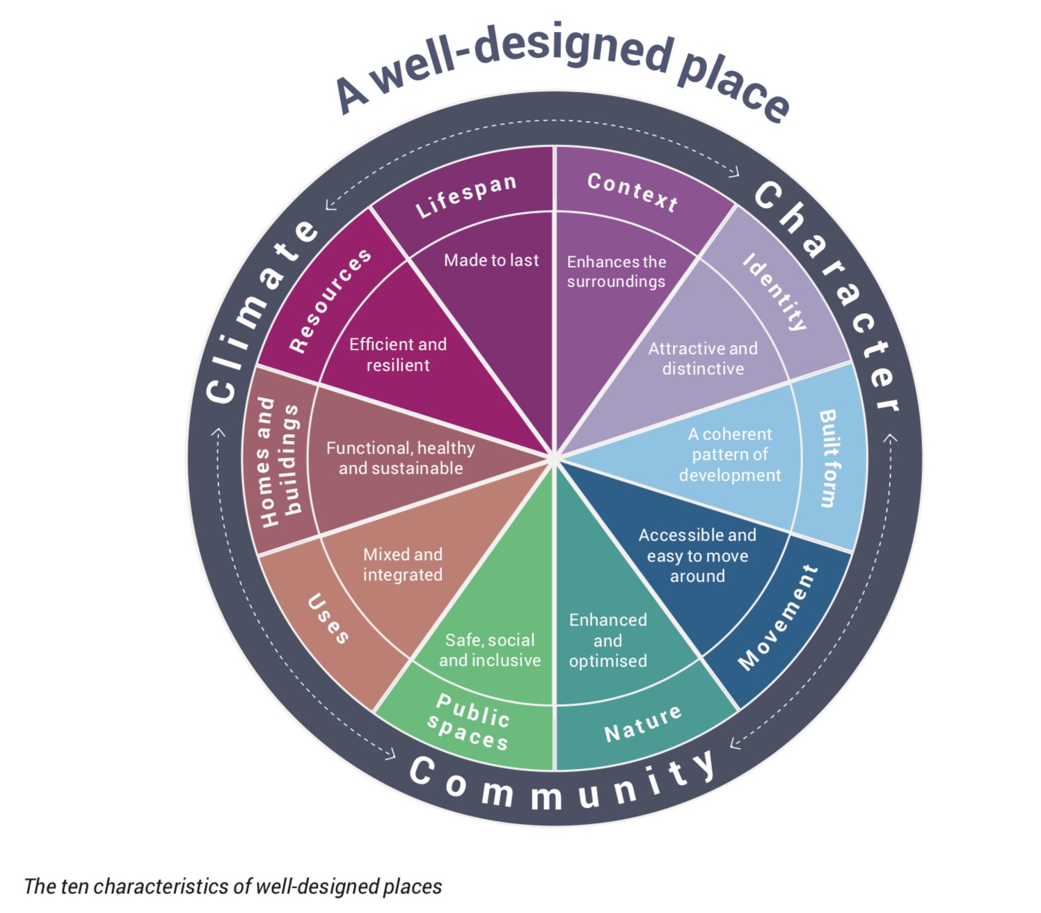 “Well-designed places have individual characteristics which work together to create its physical Character. The ten characteristics help to nurture and sustain a sense of Community. They work to positively address environmental issues affecting Climate. They all contribute towards the cross-cutting themes for good design set out in the National Planning Policy Framework.”