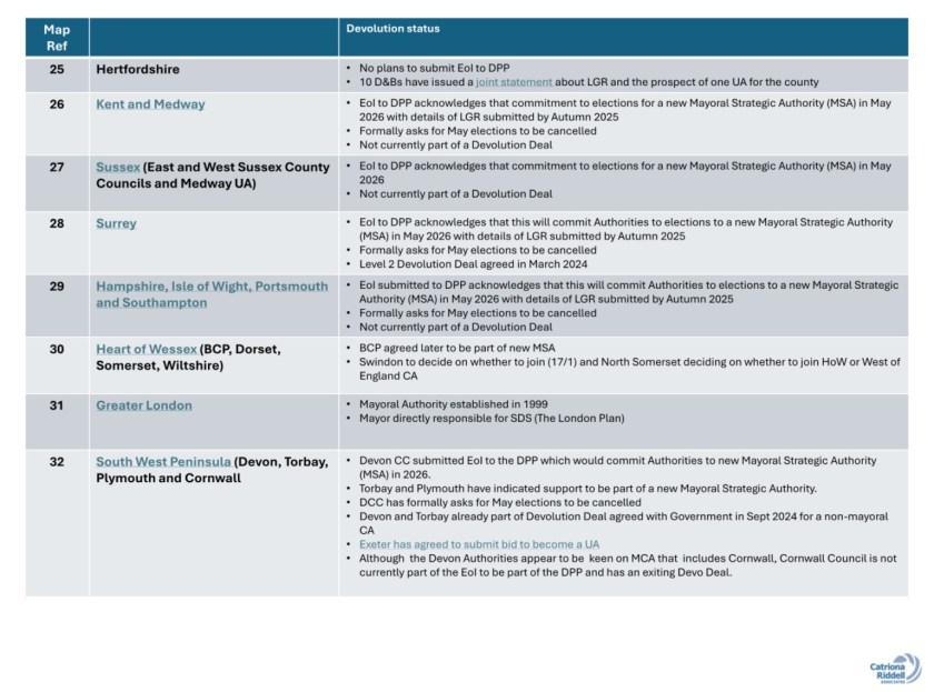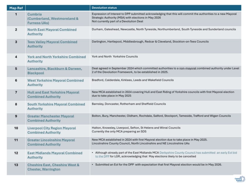 What is all this likely to mean for particular areas? I’m glad you asked me that! MHCLG has also now published a series of 16 “Area Factsheets”, providing “information on areas benefitting from English devolution, including electoral terms, route to established status, police and fire functions, distinctive governance arrangements and local government reorganisation”, for: