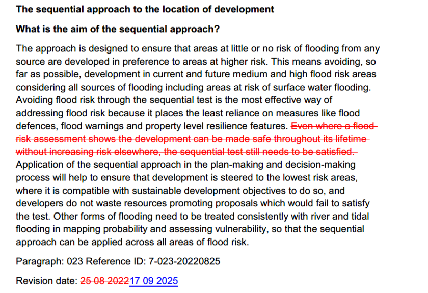 The problem is that we are still currently left with the specific reference in the PPG to the need for a sequential test in relation to areas at risk of surface water flooding (the passage I have emboldened) (and Mead Realisations v Secretary of State (Court of Appeal, 30 January 2025) of course tells us that there is no “legal principle that prevents national policy in the NPPF being amended, or altered, by guidance in the PPG.”):