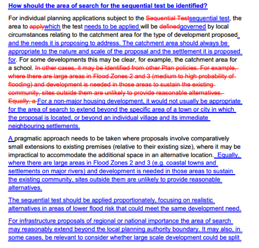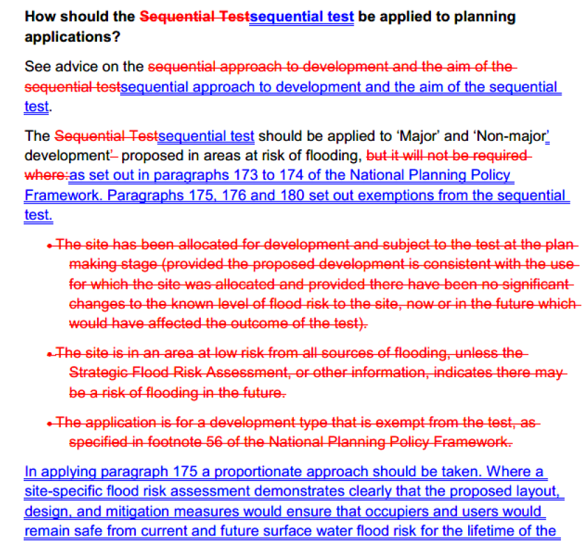 The important change is that we move from a position where the sequential approach is still required where the site is currently at risk of flooding, even where that risk would be removed as a result of development, to a position where it is not required as long as “a site-specific flood risk assessment demonstrates clearly that the proposed layout, design, and mitigation measures would ensure that occupiers and users would remain safe from current and future surface water flood risk for the lifetime of the development (therefore addressing the risks identified e.g. by Environment Agency flood risk mapping), without increasing flood risk elsewhere.” So, if your flood risk consultant is in a position to reach such a conclusion, no longer does there need to be a wide trawl for other sites, currently at lower risk of flooding, where the development might be situated. Might developers still hedge their bets and engage in a sequential testing just in case an issue arises? I suspect so, but this change is certainly going to simplify applicants’ case as to flood risk matters in many instances – particularly, I suspect, where the only potential risk arising is by way of the accumulation on site of surface water.