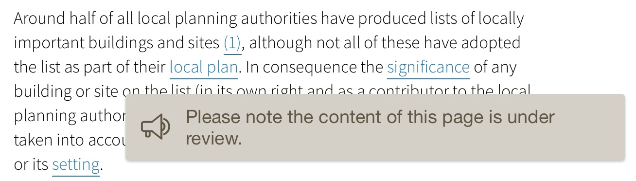 The content of Historic England’s advice on locally listed heritage assets is identified as “under review” (presumably linked to the Government’s announcement).